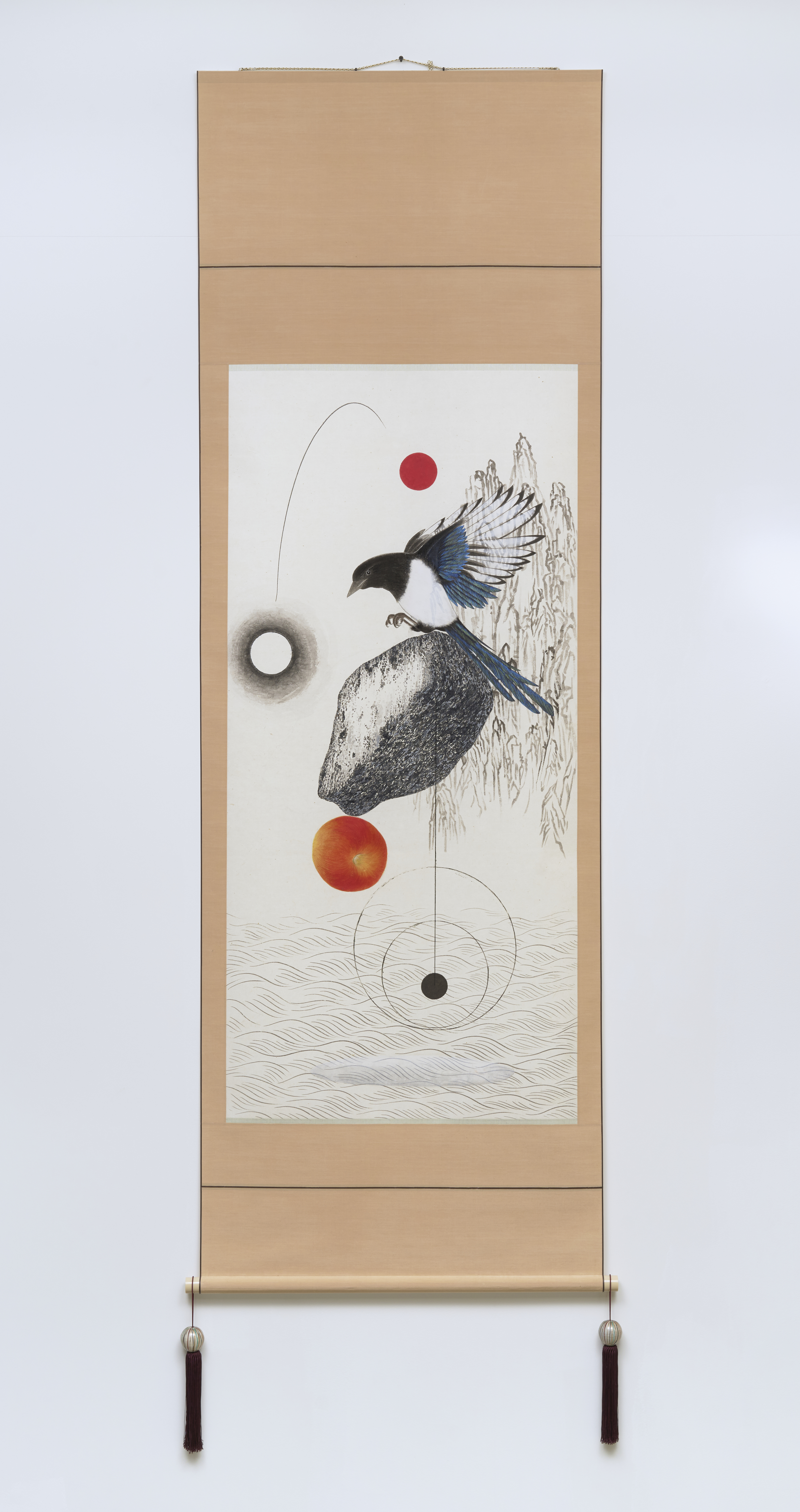 얽힘의 포털과 정지의 무게 고아빈 작가는 이번 엔탱글먼트 작품전에서 Entanglement Project 2025를 출품했는데, 이 작품은 작품전 전체의 발문으로서 작품전 전체를 대표하고 상징한다. 순지에 먹, 카본, 분채를 섞어 그린 새와 바위, 무의미한 원들은 동양적 자연스러움을 마그리트적 추상적 구도로 해체하고 재배치하면서...